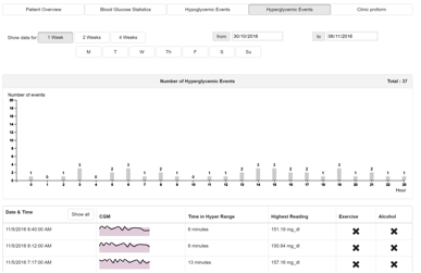 The hyperglycaemic events page (Figure 10) is used to provide quick access and visualisations of all hyperglycaemic events for a defined period of time. The functionality mirrors that of Hypoglycaemic events (Section 3.4.3.3) for Hyperglycaemic events.