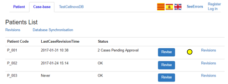 The initial page for the case-base section of the PWI is a list of patients, stating the last case revision and number of pending cases, as shown in Figure 12. Yellow and red circles are included beside each patient to indicate urgency of any pending case revision. Selecting a patient from the list will show the patient’s cases pending revision (Section 3.5.2).